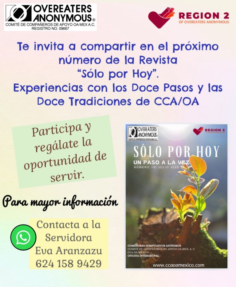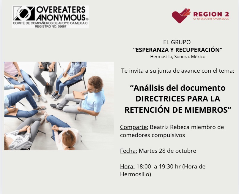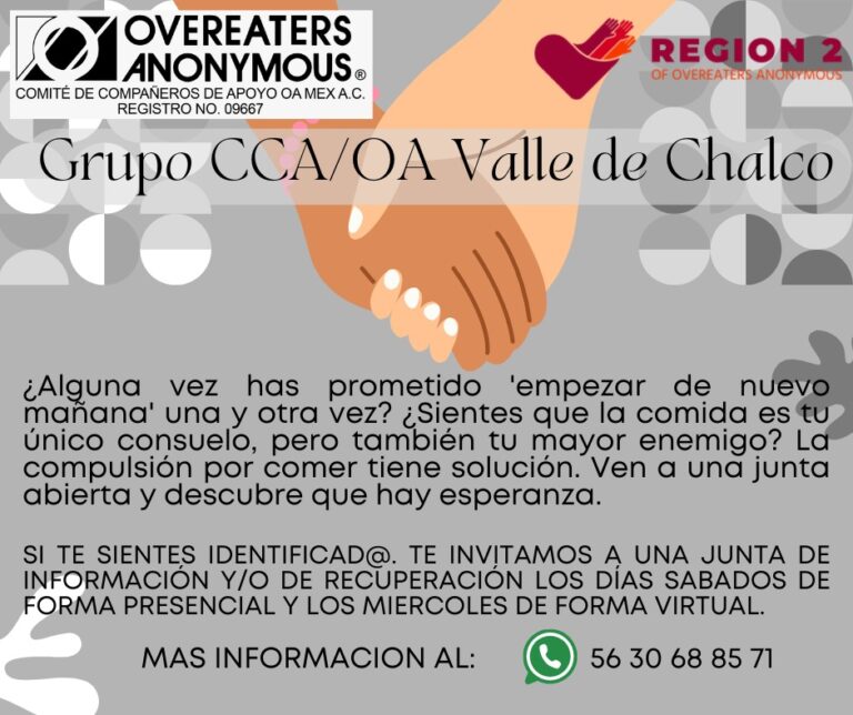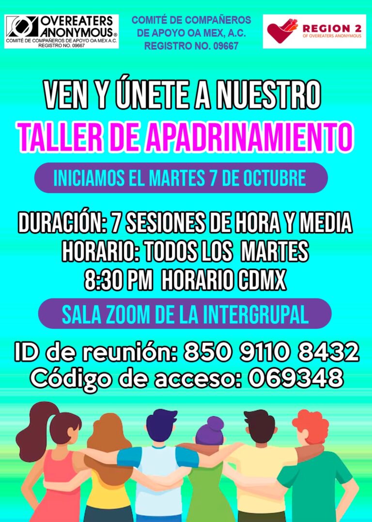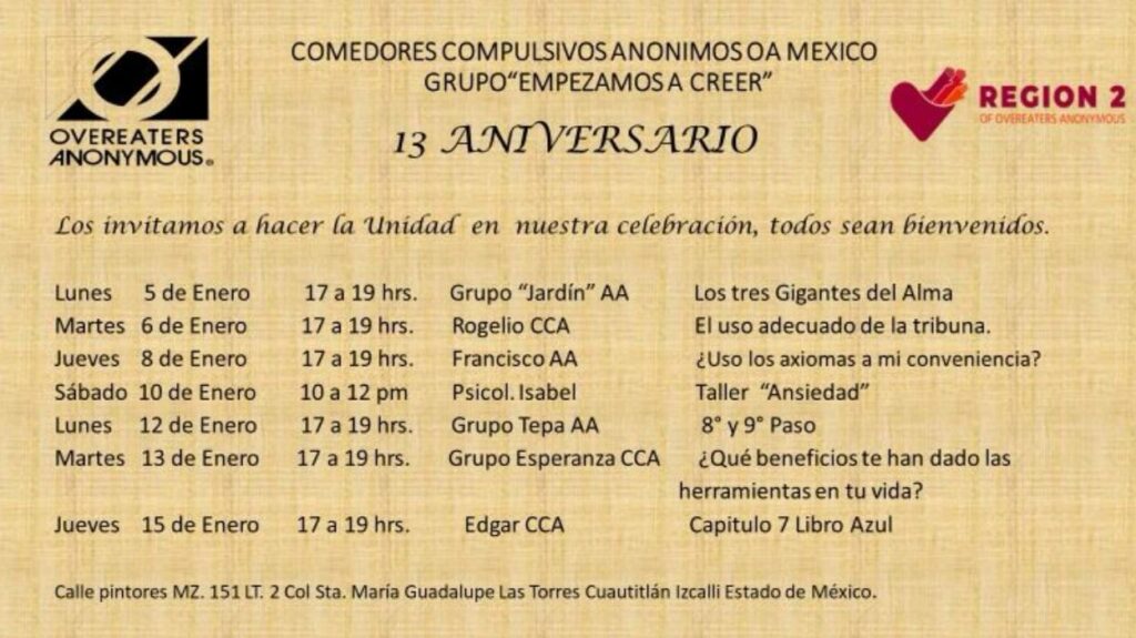 Para conocer detalles sobre los eventos EN IDIOMA INGLÉS, organizados por la Región 2 y por la Oficina Mundial de Comedores Compulsivos Anónimos / OA, has «click» en cada ícono, según corresponda: