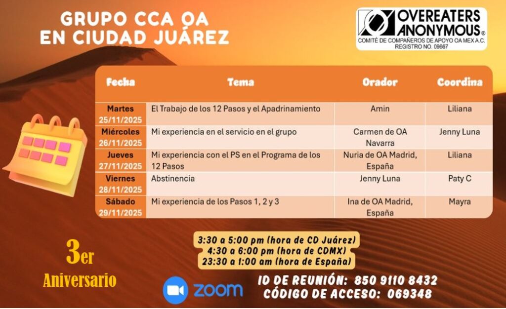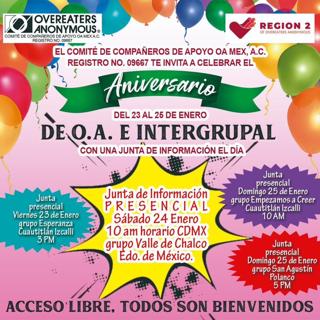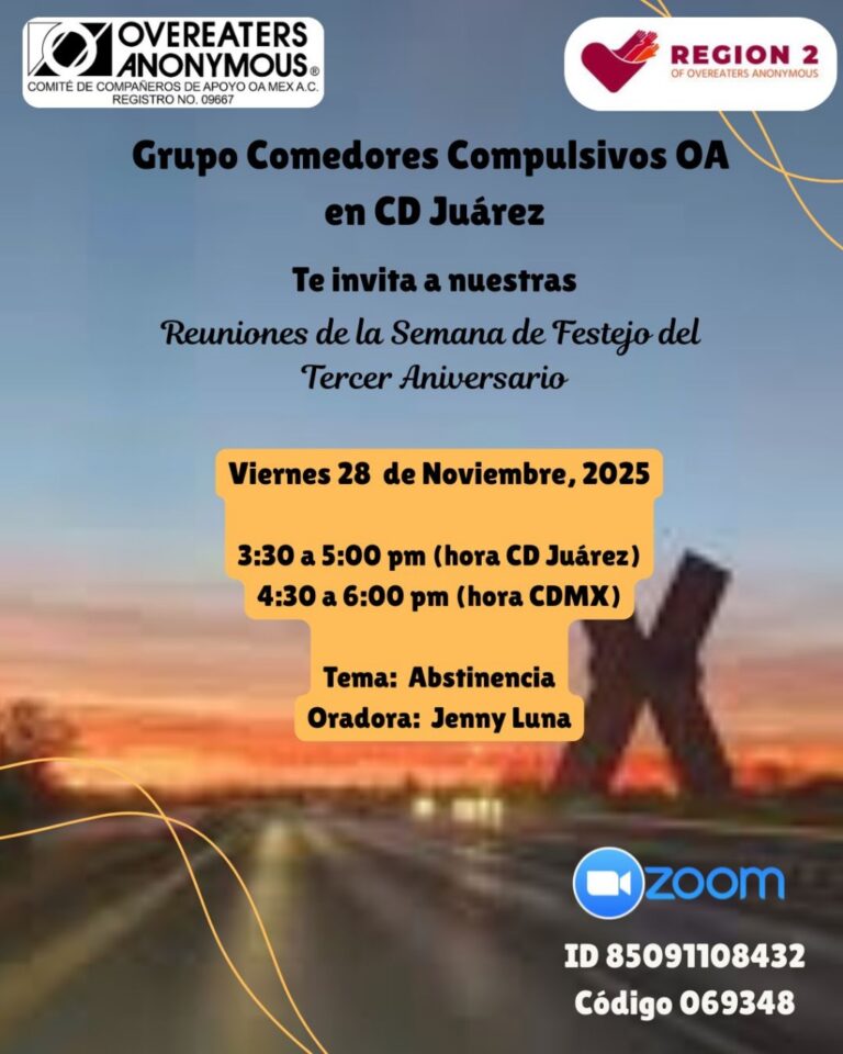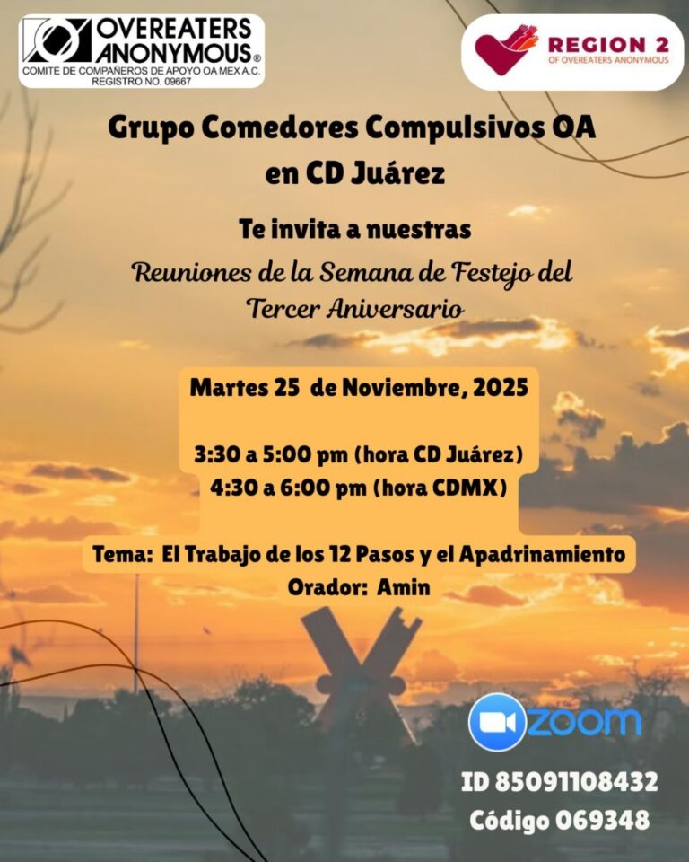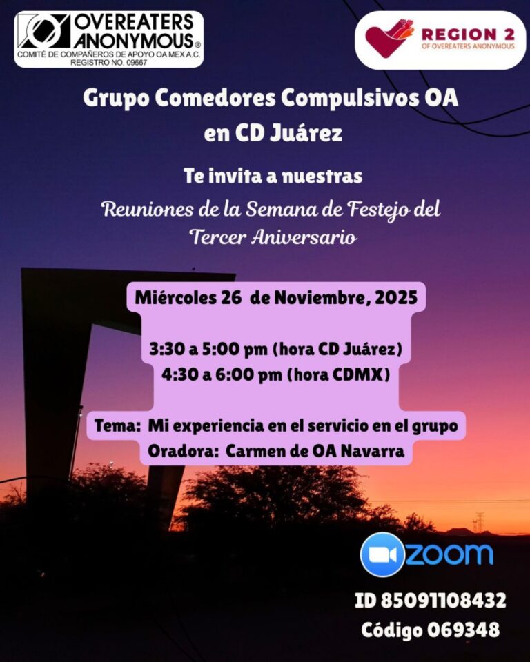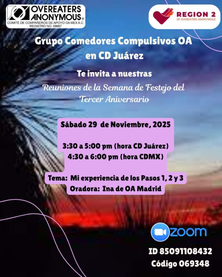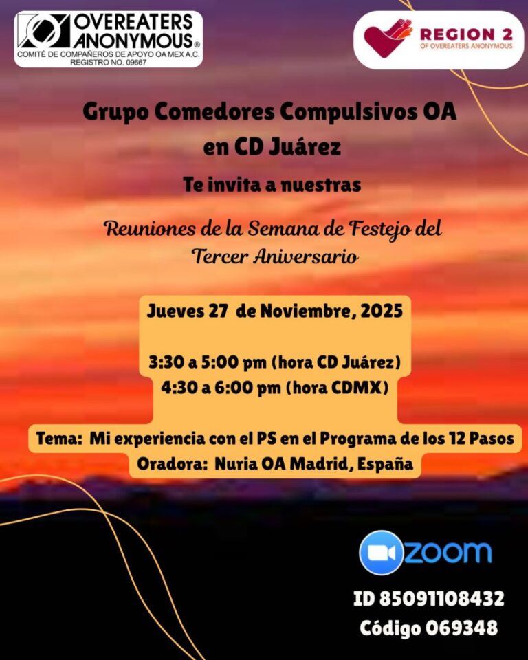 Para conocer detalles sobre los eventos EN IDIOMA INGLÉS, organizados por la Región 2 y por la Oficina Mundial de Comedores Compulsivos Anónimos / OA, has «click» en cada ícono, según corresponda: