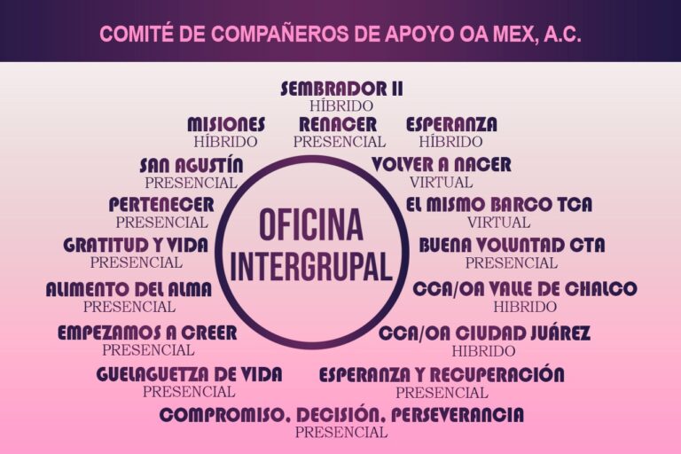Te sugerimos ingresar al enlace https://www.ccaoamexico.com/grupos/ en donde encontrarás la información sobre las reuniones presenciales de grupos que pertenecen a nuestra Oficina Intergrupal; adicionalmente, en caso de que no exista ninguna reunión presencial en tu zona de interés, en https://www.ccaoamexico.com/reuniones-virtuales/ encontrarás la información disponible de las reuniones virtuales de los grupos con los que contamos actualmente, en los que podrás acceder desde cualquier lugar del mundo.